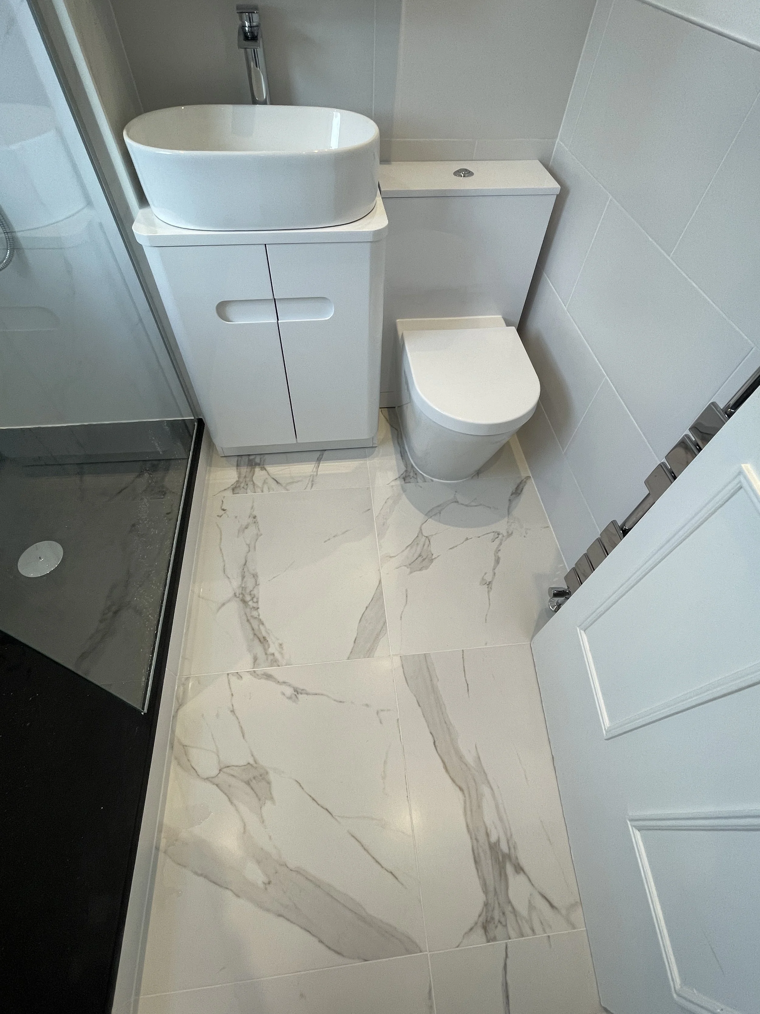 Bathroom with waterproof panels, floor standard tiling