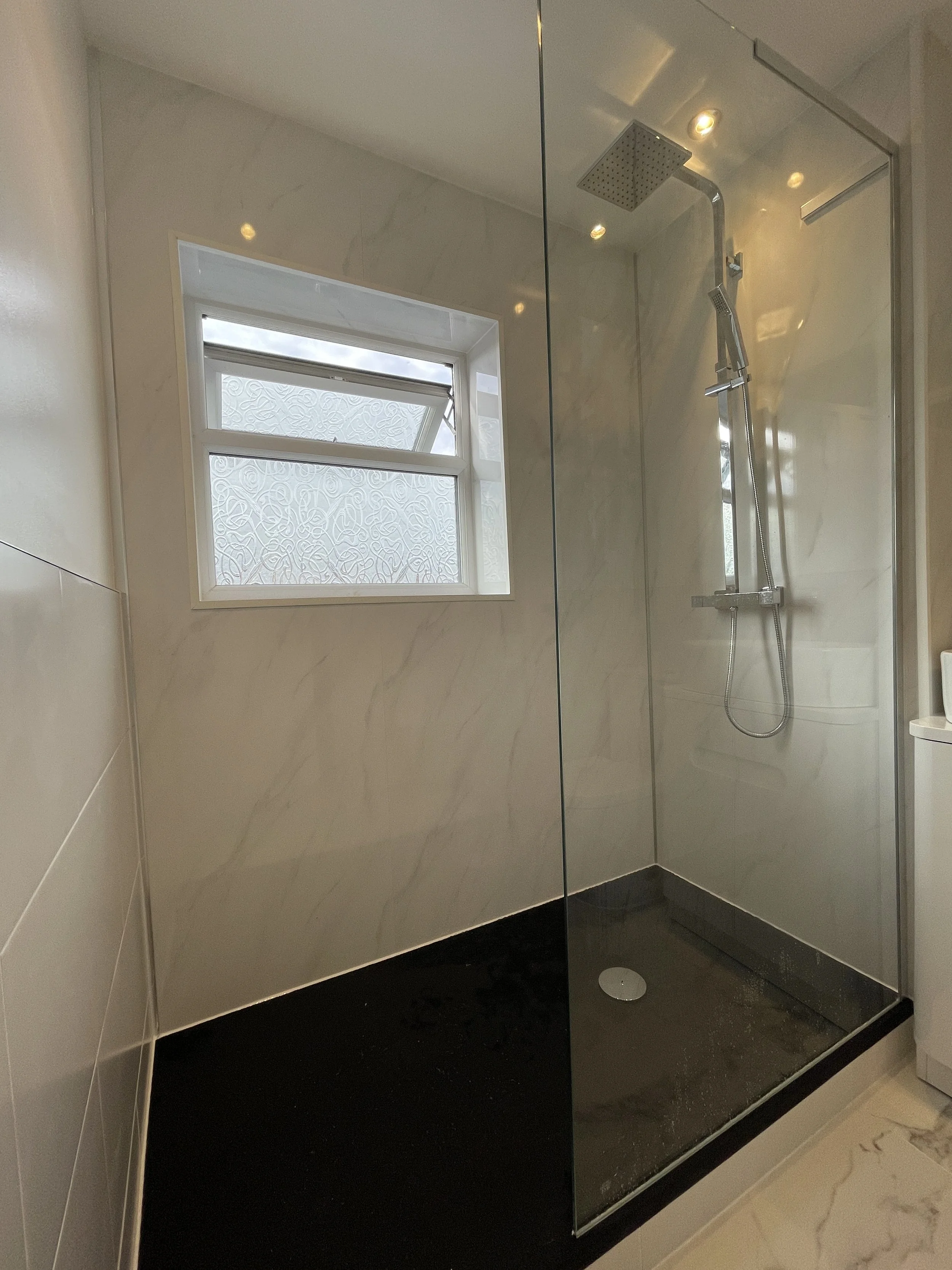 A shower with grey volterra gloss waterproof panels